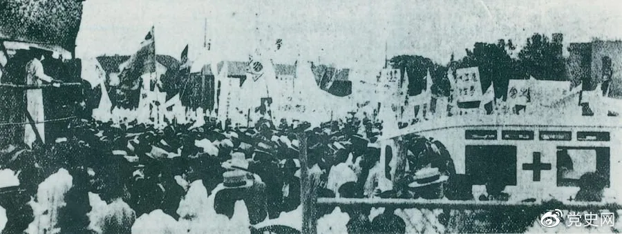 ▲1925年6月7日,中国共产党通过上海总工会联合上海学生联合会、上海各马路商界联合会等,成立了上海反帝运动的领导机关——工商学联合会。11日,在该会的主持下,上海20万群众集会,通过了逞凶、赔偿、取消领事裁判权等17项对外交涉条件。图为大会盛况。