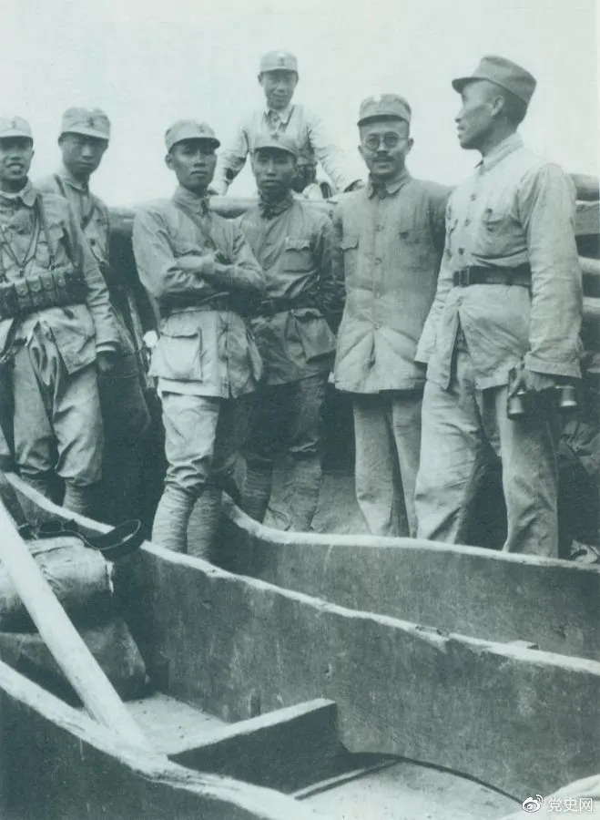 ▲1937年9月,八路军部分领导人率部东渡黄河,开赴抗日前线。图为渡船上的八路军领导人,前排右起:朱德、任弼时、左权。