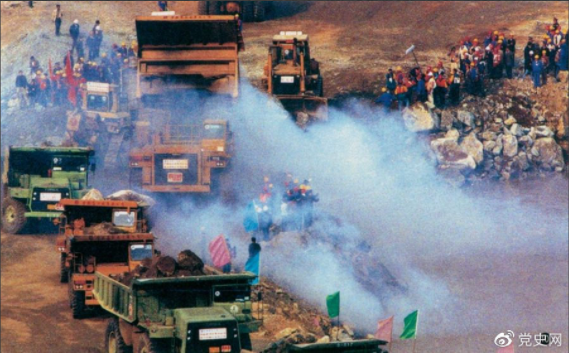 1997年11月18日,长江三峡水利枢纽工程成功实现大江截流。这是400多辆巨型装载车紧张有序地向上游围堰口抛投石料。