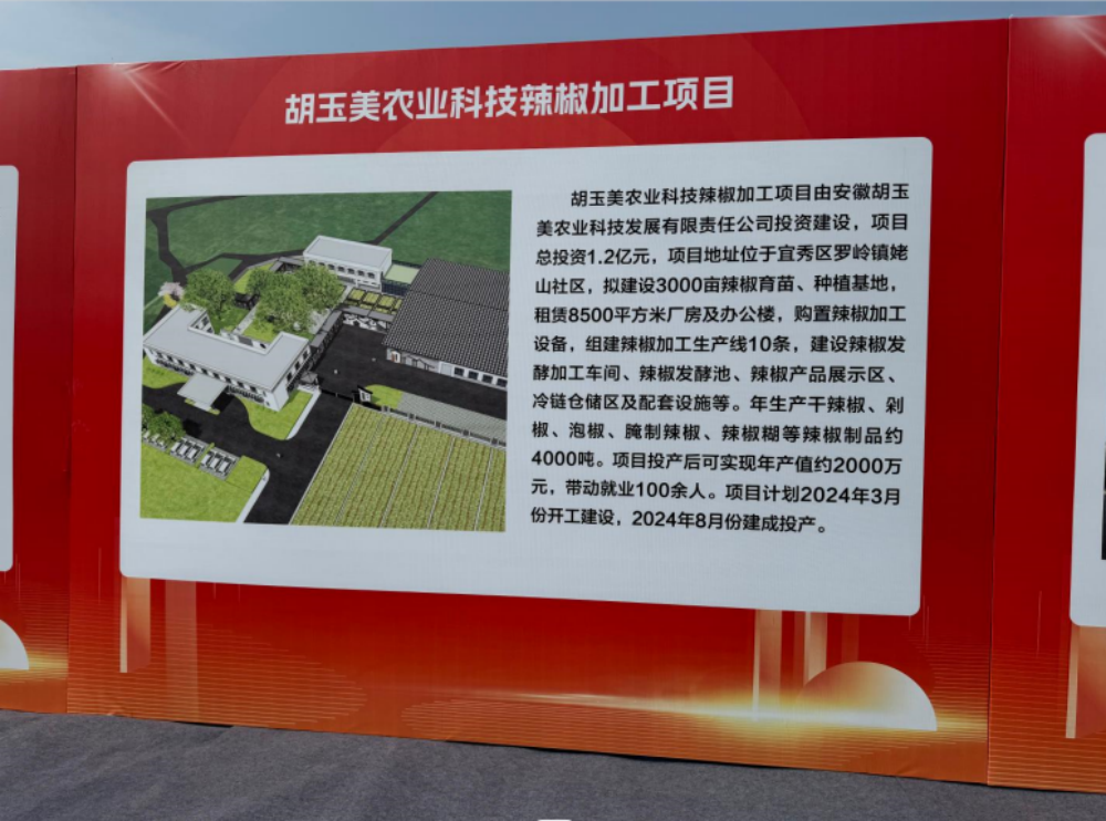 胡玉美农业科技辣椒加工项目总投资1.2亿元,地址位于宜秀区罗岭镇姥山社区,拟建设3000亩辣椒育苗、种植基地,租赁8500平方米厂房及办公楼,购置辣椒加工设备,组建辣椒加工生产线10条,建设辣椒发酵加工车间、辣椒发酵池、辣椒产品展示区、冷链仓储区及配套设施等。年生产干辣椒、剁椒、泡椒、腌制辣椒、辣椒糊等辣椒制品约4000吨。项目投产后可实现年产值约2亿元,带动就业100余人!