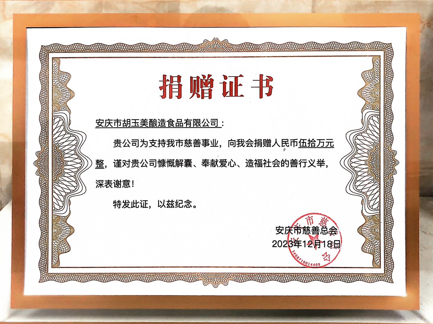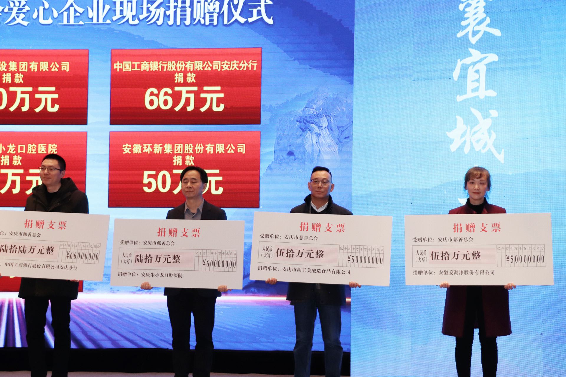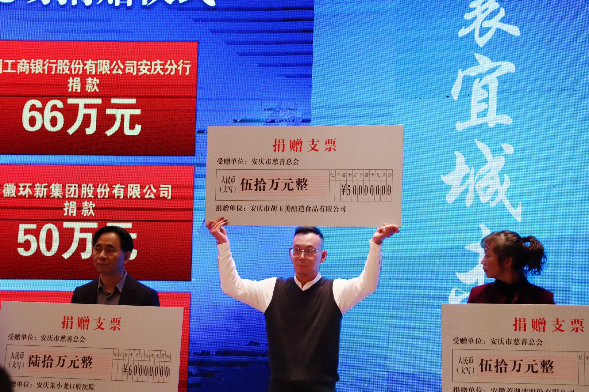 12月18日下午,安庆市首届慈善大会在安庆栢景国际酒店隆重召开,在爱心企业现场捐赠仪式上,公司党委书记、董事长颜志勇代表胡玉美再次捐资50万元,于市慈善总会设立胡玉美冠名基金。副总经理昝幼龙陪同参会。