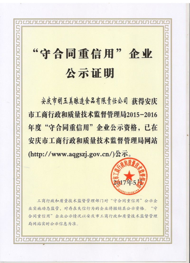 为推进企业诚信建设,规范企业合同行为,引导企业诚信履约、守法经营,在安庆市工商质监局组织开展的安庆市级2015-2016年度 “守合同重信用”企业评审活动中,公司成功获得“守合同重信用”企业称号。