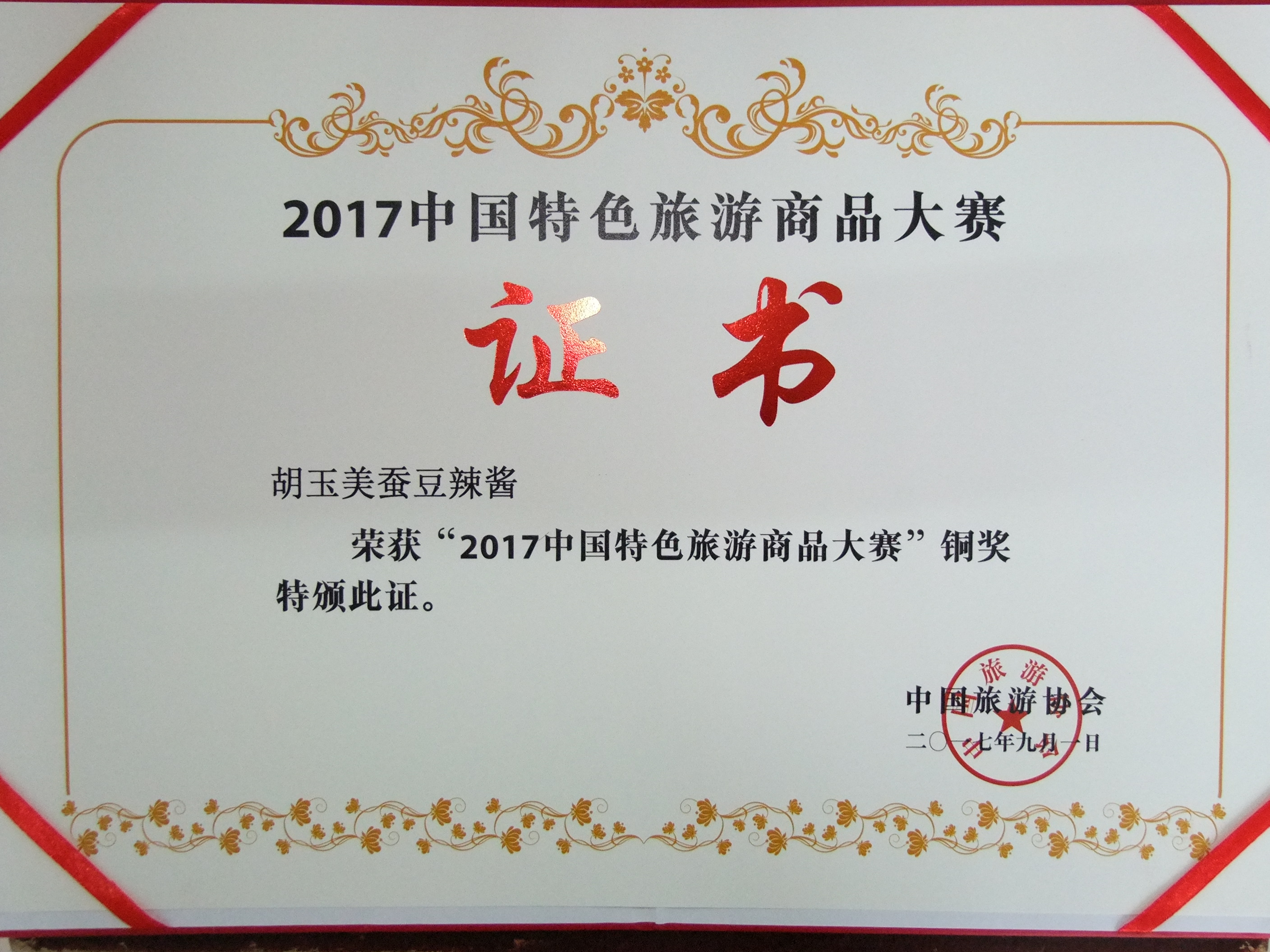 2017年9月份由中国旅游协会、内蒙古自治区旅游发展委员会、包头市人民政府主办的首届民族旅游商品博览会和民族特色旅游商品大赛在包头国际会展中心开幕,来自全国31个省、市、自治区和新疆生产建设兵团约15000余件特色旅游商品参赛,国内外近千家旅游商品企业参展。安庆市旅游局精心选送的旅游商品中共有4件旅游商品获奖,其中,公司选送的“胡玉美蚕豆辣酱”代表安庆市在本届大赛中喜获一枚铜奖,同时我胡玉美公司也有幸成为安庆市区唯一一家获奖单位。