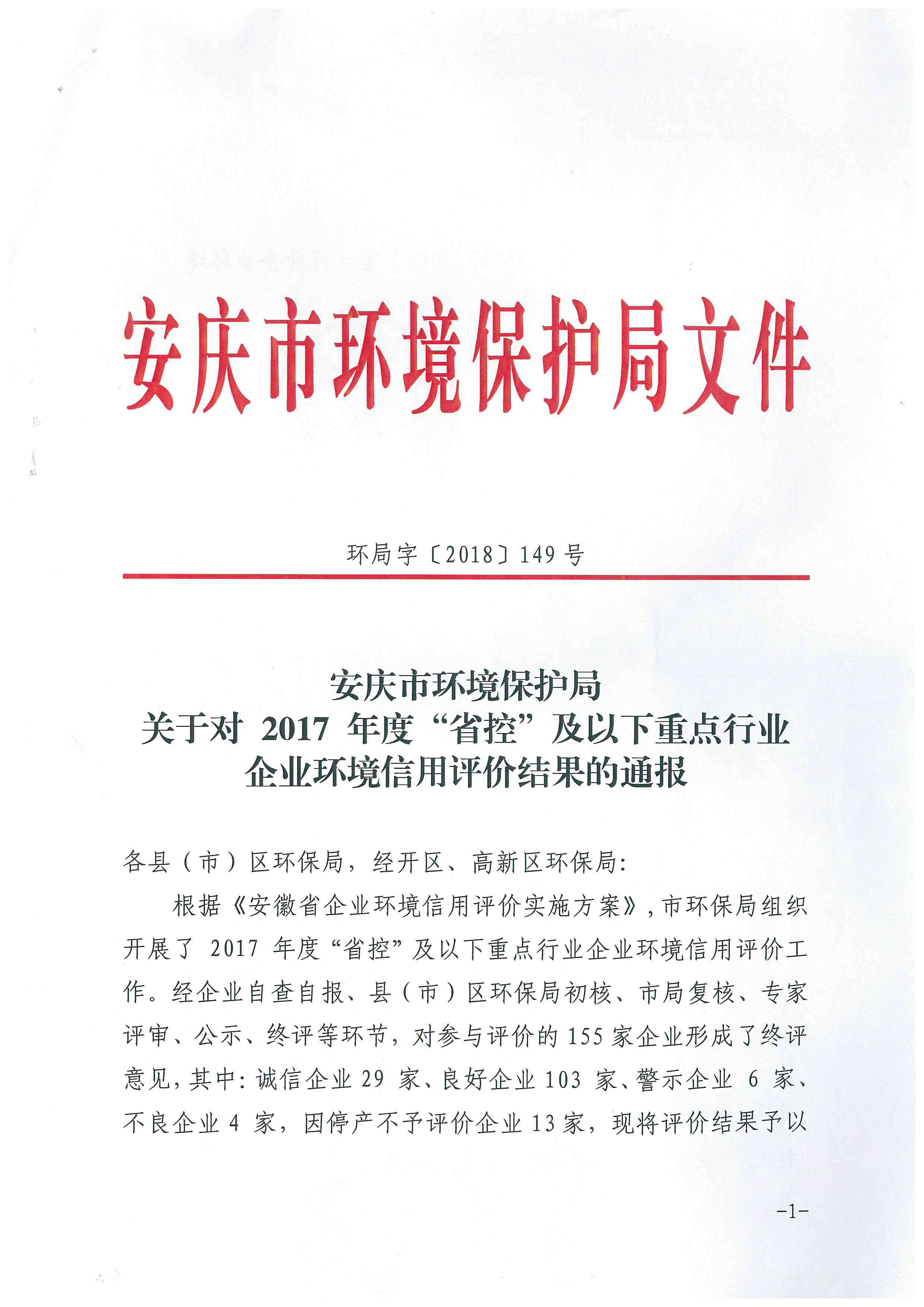 企业环境信用评价结果的通报文件