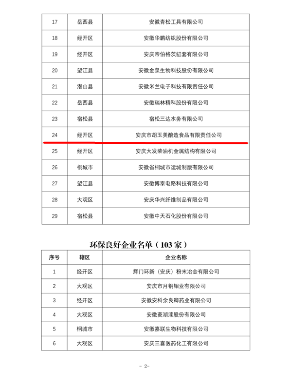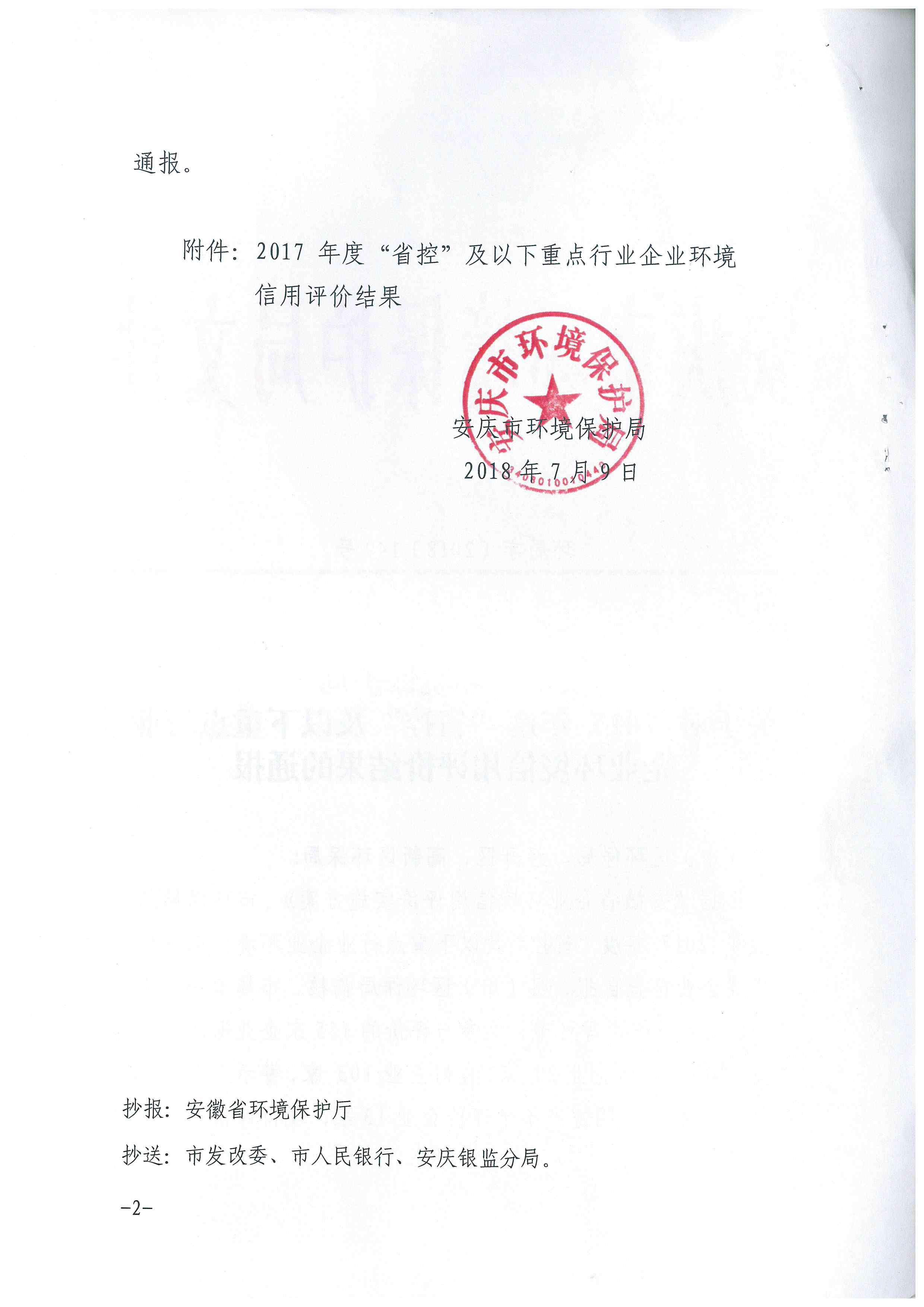 2018年7月9日,根据《安徽省企业环境信用评价实施方案》,经企业自查自报、县(市)区环保局初核、市局复核、专家评审、公示、终评等环节,参与2017年度“省控”及以下重点行业企业环境信用评价的155家企业中,共有29家企业被安庆市环境保护局评定为“环保诚信企业”。公司荣列29家“环保诚信企业”之中。